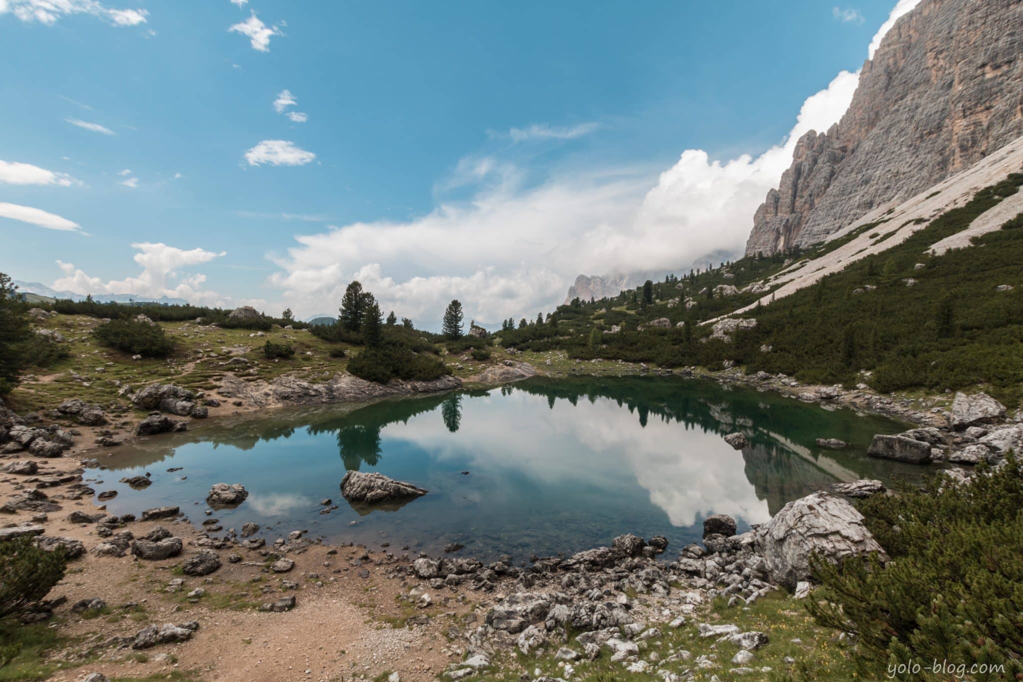 כאמור, לאחר מספר דקות ירידה מהפאס נגלה לפנינו נוף מדהים שחלק ממנו הוא אגם לאגאזוי (Lagazoui) המהמם בצבע הטורקיז שלו. מכאן, גם, ראינו את המשך הדרך של מחר בבוקר לבקתת לאגזוי וגם את הבקתה עצמה מתנשאת בראש ההר.