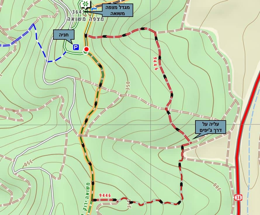 מכאן תטפסו בחזרה על ההר, בחזרה למצפה משואה. בחלק האדום יש מספר עליות וירידות תלולות ולכן הגדרתי אותו ברמת קושי בינונית. למרות זאת הוא כן מתאים לילדים קטנים, שמתורגלים בהליכה וגם לכלבים.