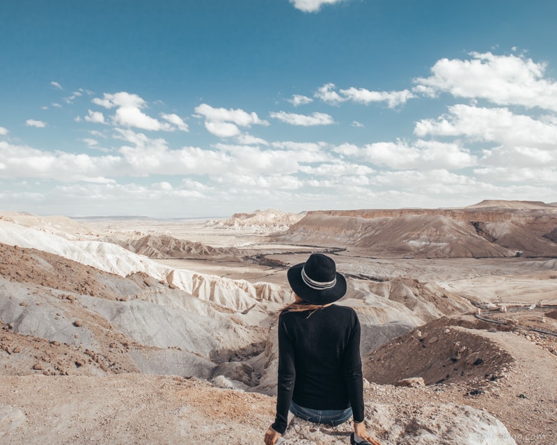 תצפית מרהיבה אל מכתש רמון, מתוך "מרפסת" שתלויה מעל המכתש. כחובבת נופים מדבריים, זו ללא ספק אחת התצפיות האהובות עלי בארץ. אם אתם כבר באזור, לדעתי מאוד מעניין להיכנס למרכז המבקרים (הכניסה בתשלום, רשות הטבע והגנים), המסביר על המכתש: אופן היווצרותו, התופעות הגאולוגיות ועולם החי והצומח שבו וגם מספר את סיפורו המרתק של האסטרונאוט אילן רמון ז"ל.